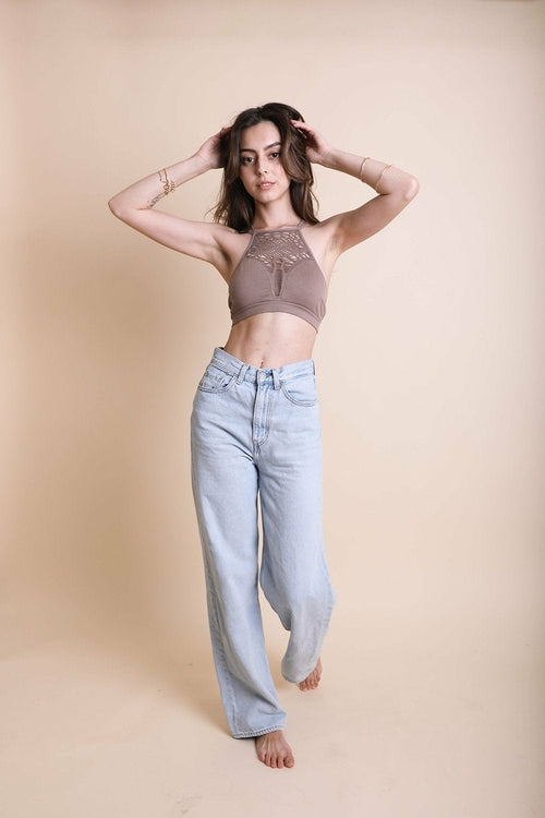 For the girl who can't control her whimsical side, this high neck bra top has you covered. The pretty floral cutout and strappy back details will add a little dash of flair to your casual or dressy outfits.