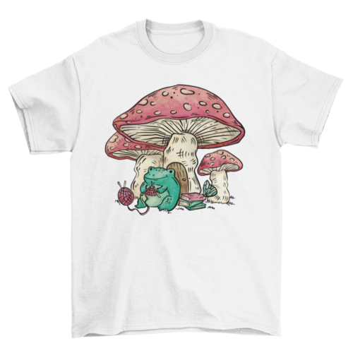 Cute t-shirt design featuring a mushroom house and a frog knitting.